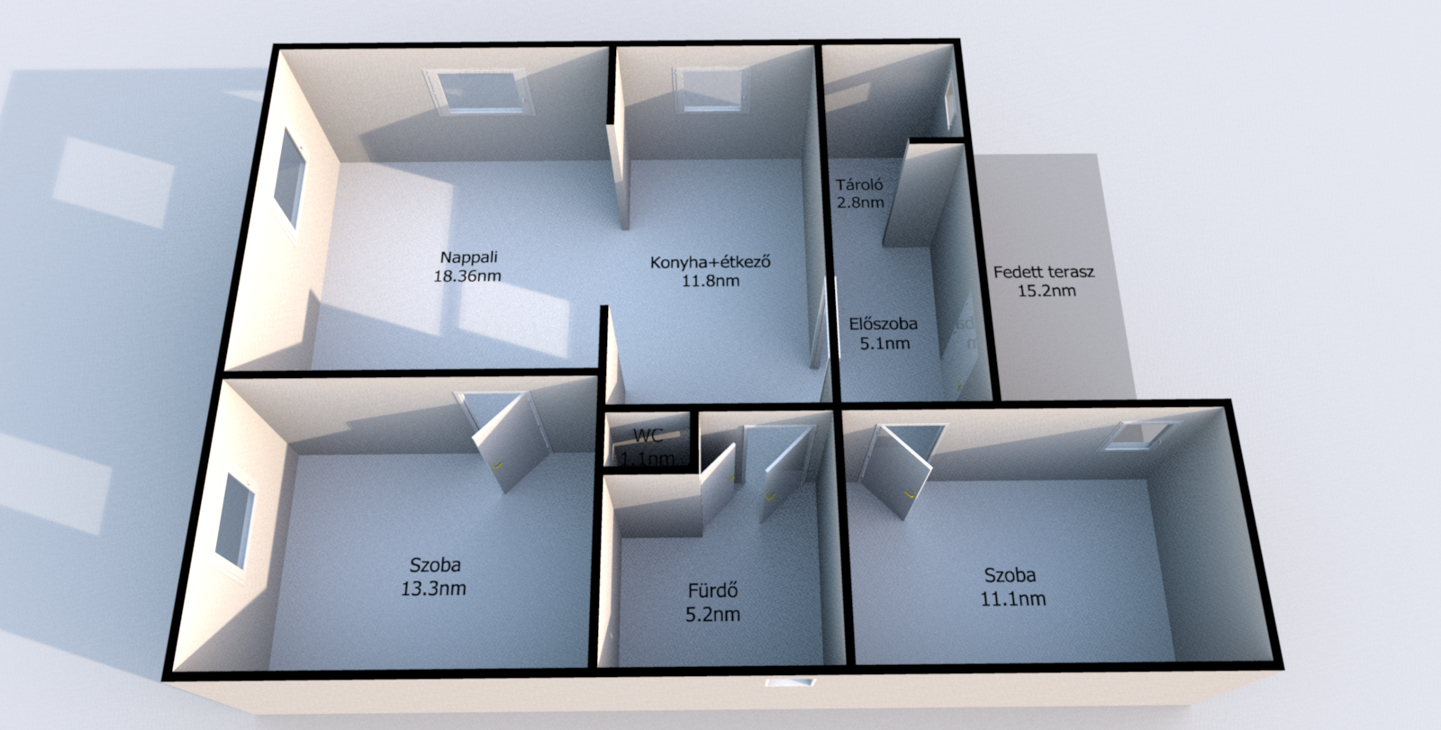 - Belső nyílászárók: teli ajtó laminált felülettel