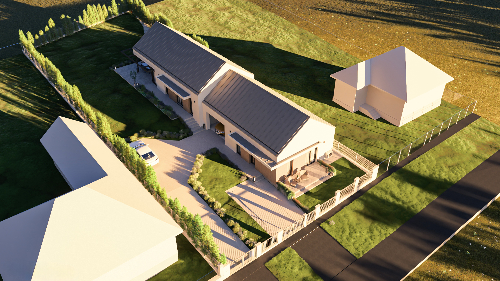 - Kerítés: egyszerű kerti szegély lábazat, vas oszlopok, közte deszka borítás, gyalult, festett kivitellel illetve lamellás szürke kerítéselemek a lakások között elválasztva. Az utca felé zsalukő lábazat, fehér színezéssel, beton oszlopokkal 1,8m magas, közte deszka borítással, antracit szürke színnel.