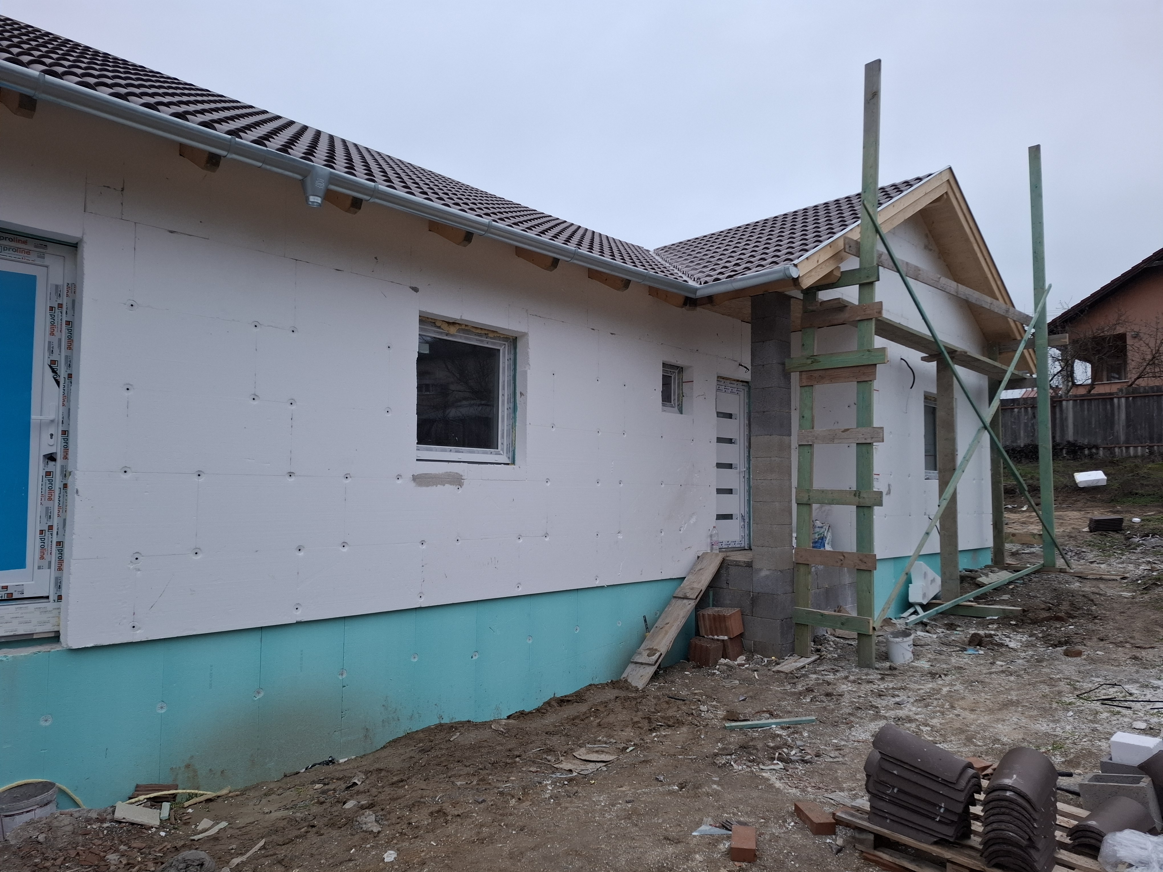 9. Az épület külső homlokzatát, színezését 15 cm vastag EPS 80 polisztirol lap hőszigeteléssel és 1,5 mm Baumit kapart színvakolattal készítjük. Lábazatra 12cm-es XPS szigetelés kerül, Revco mini gránit lábazati vakolat felhasználásával