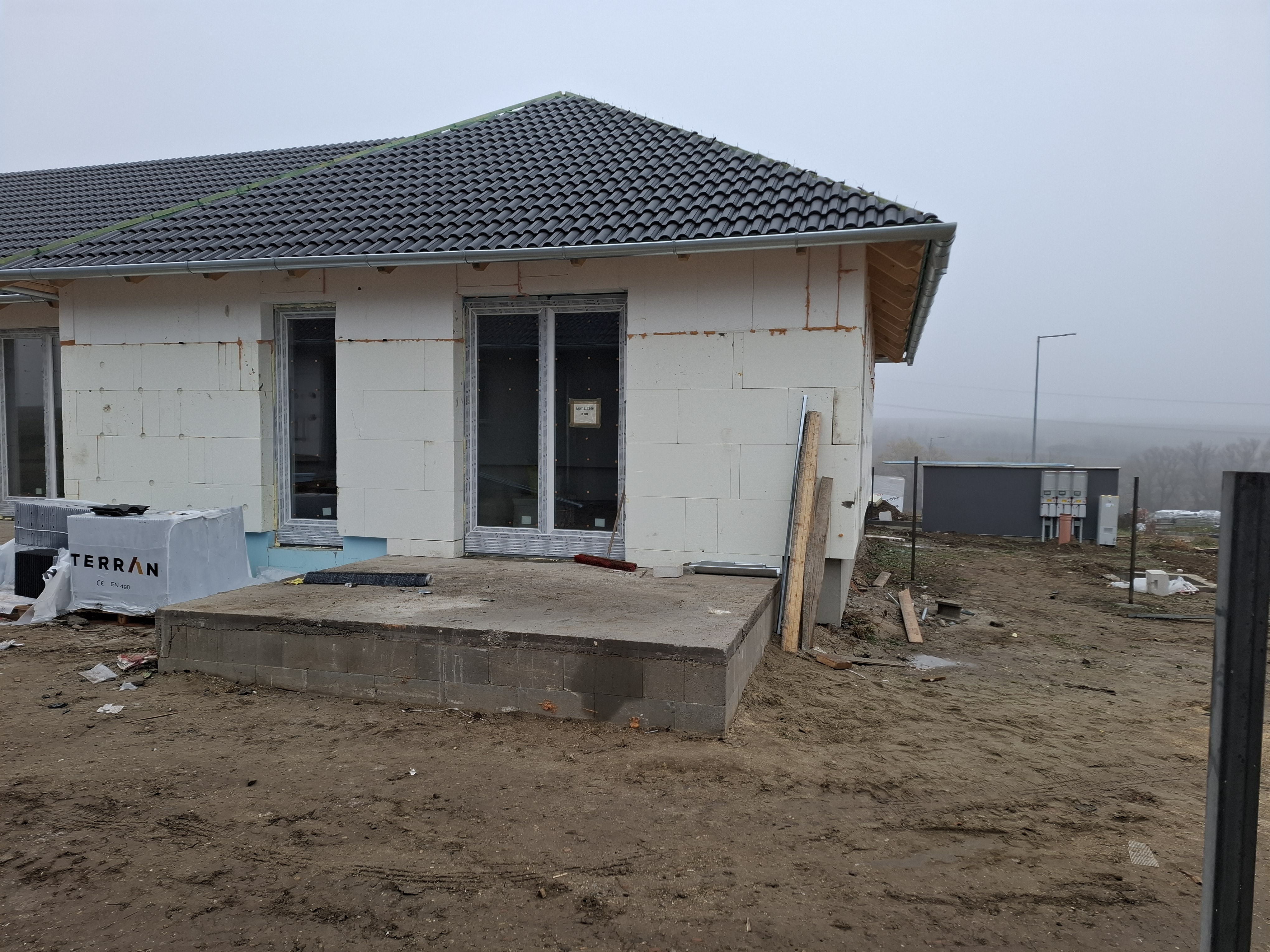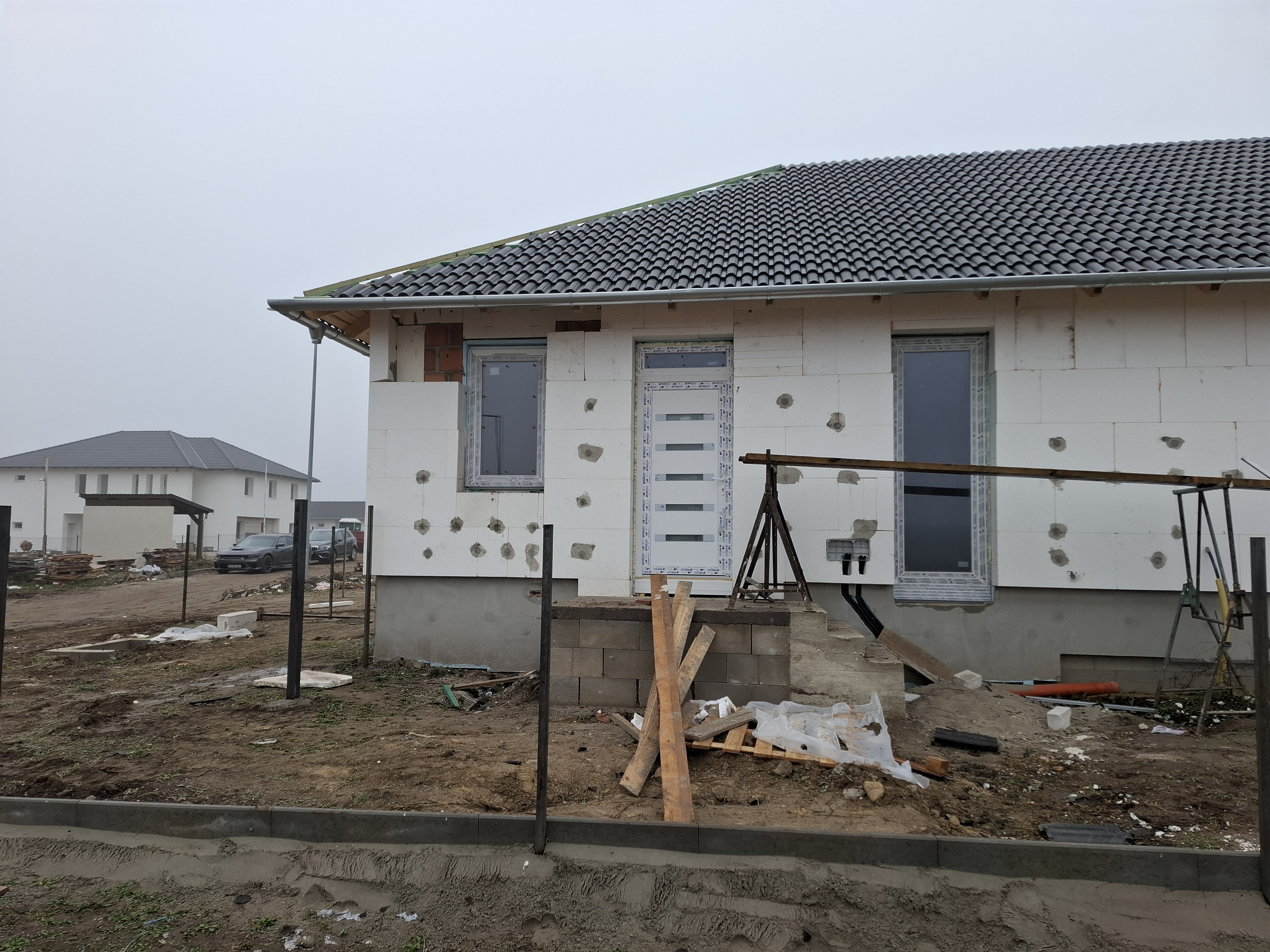 - Homlokzatvakolat: a fűtött terekhez kapcsolódó homlokzat a szükséges helyeken 15 cm EPS hőszigetelést kap, amelyre színvakolat kerül. A homlokzati szín az engedélyes tervektől eltérhet a környezet miatt. A Vevő ezzel kapcsolatban kártérítési igénnyel nem élhet.