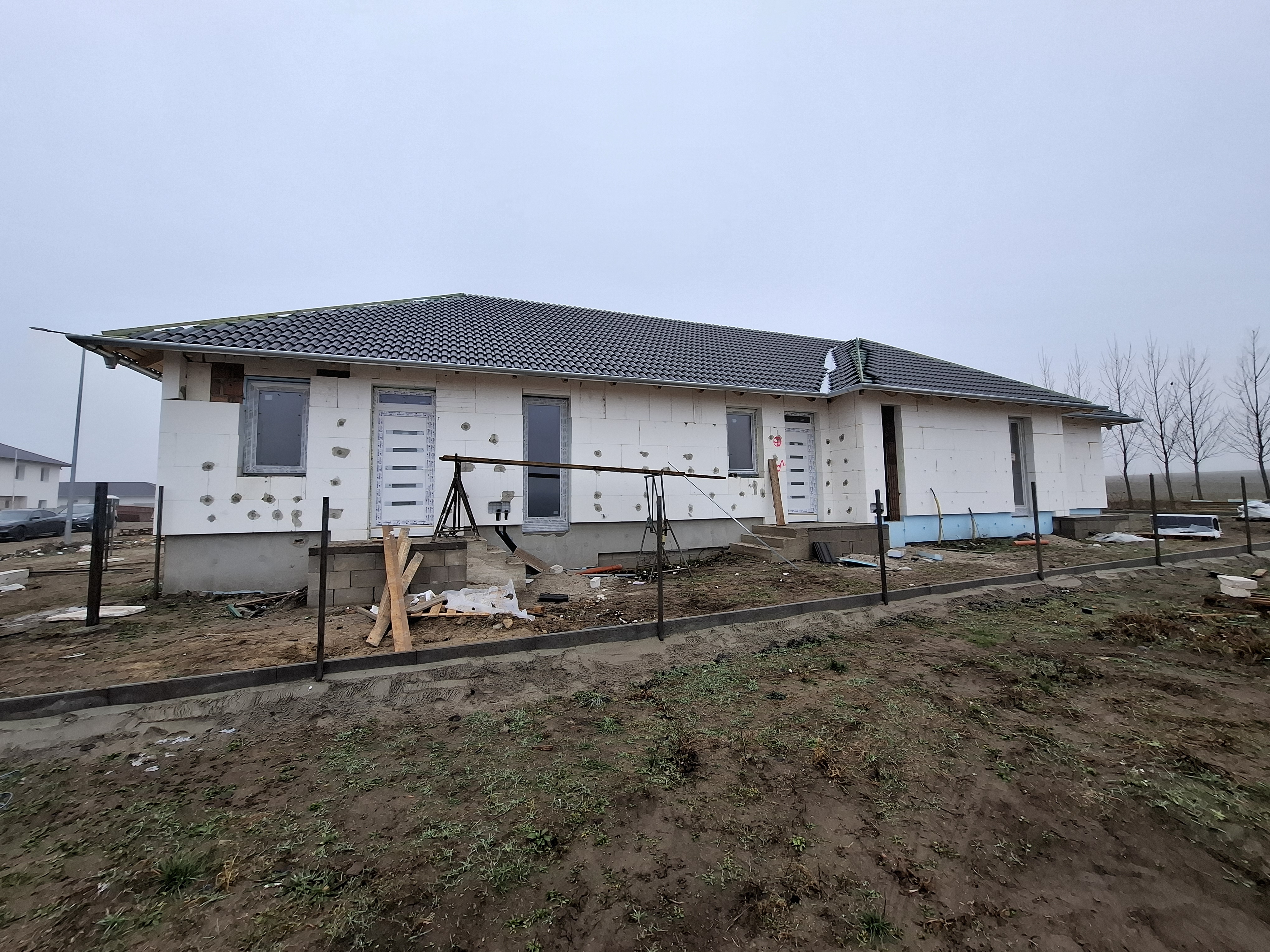 - Tetőszerkezet: hagyományos fa tetőszerkezet, 25 cm szigetelés az emeleti födémen terv szerint.