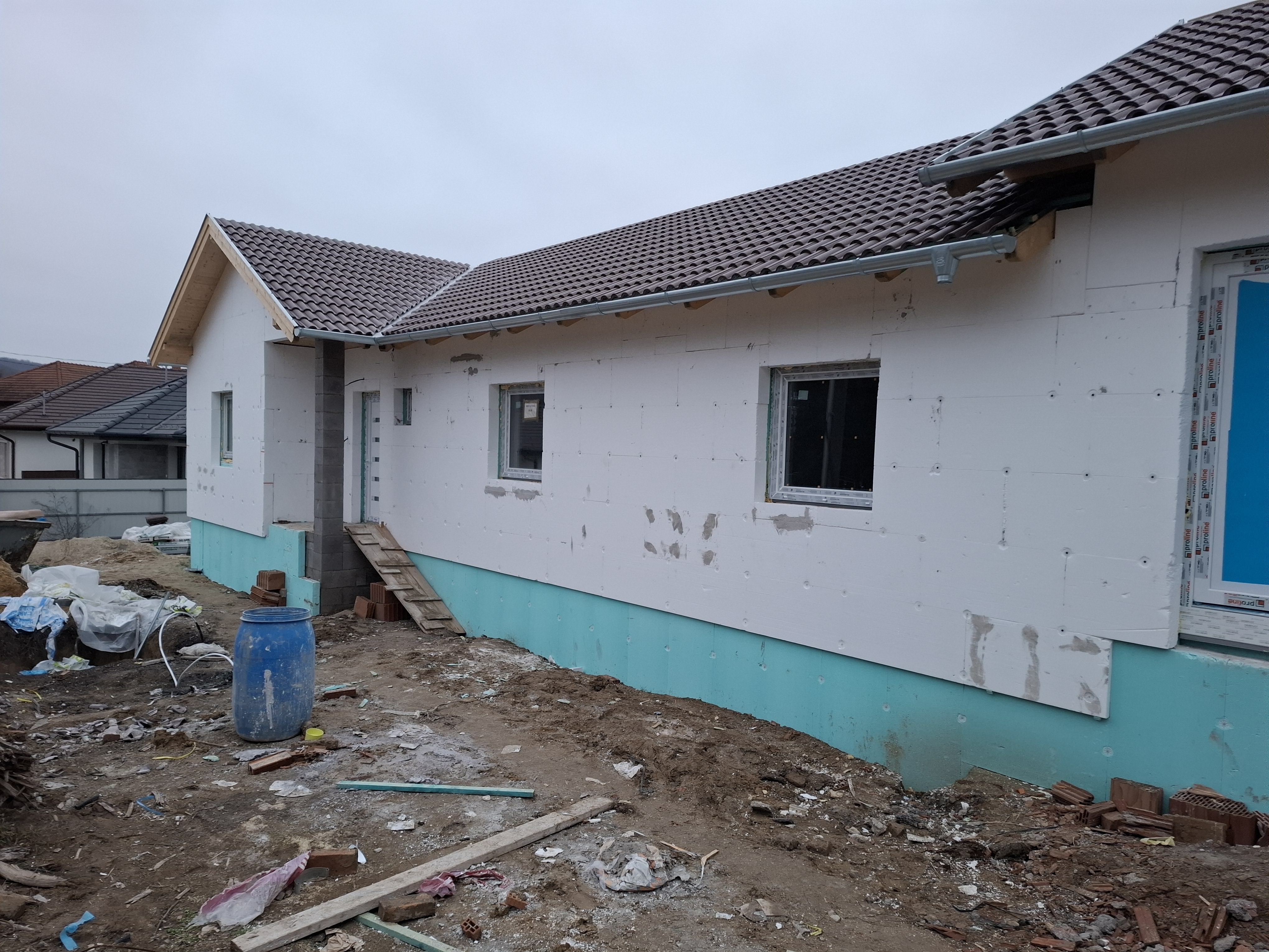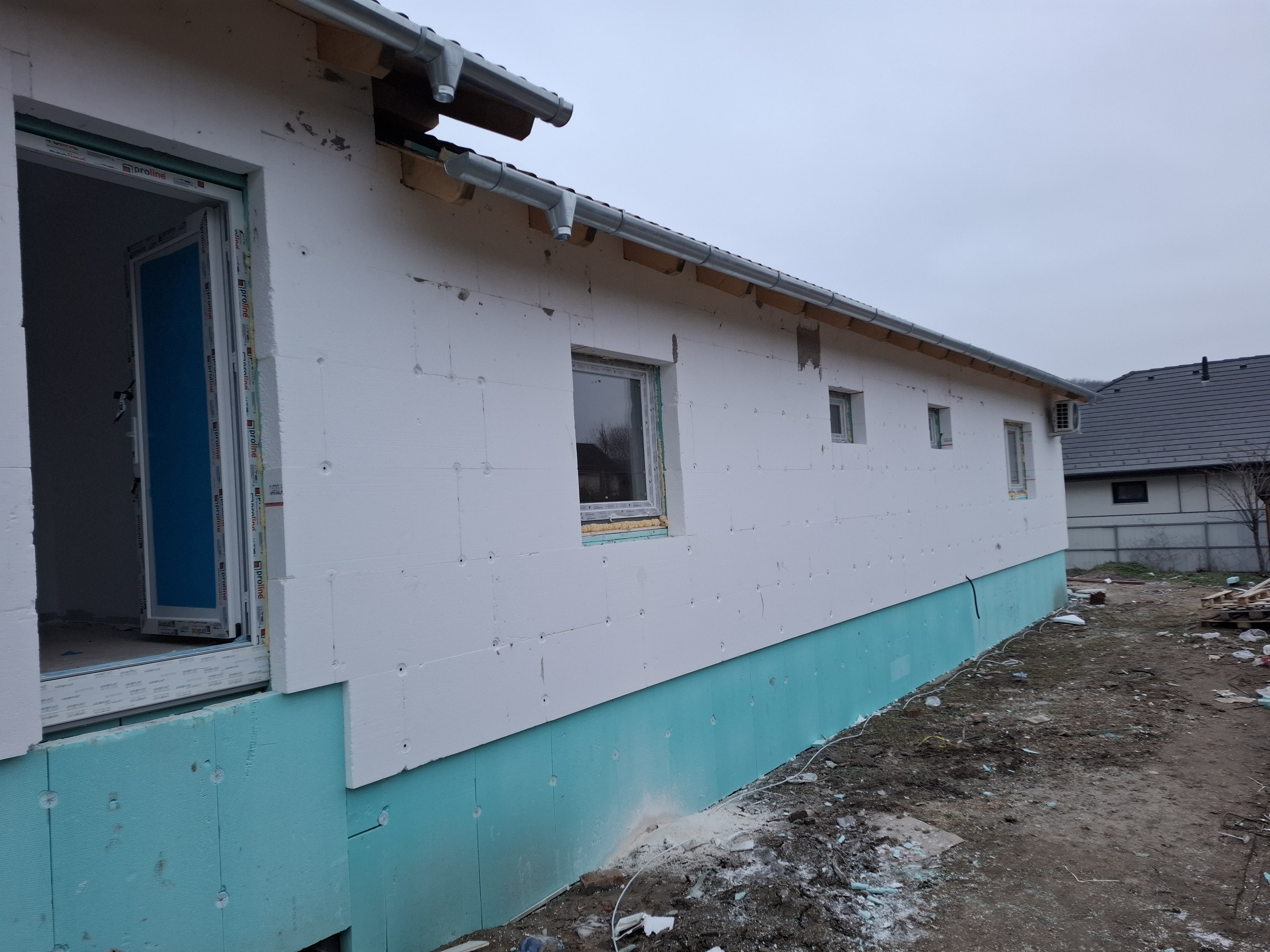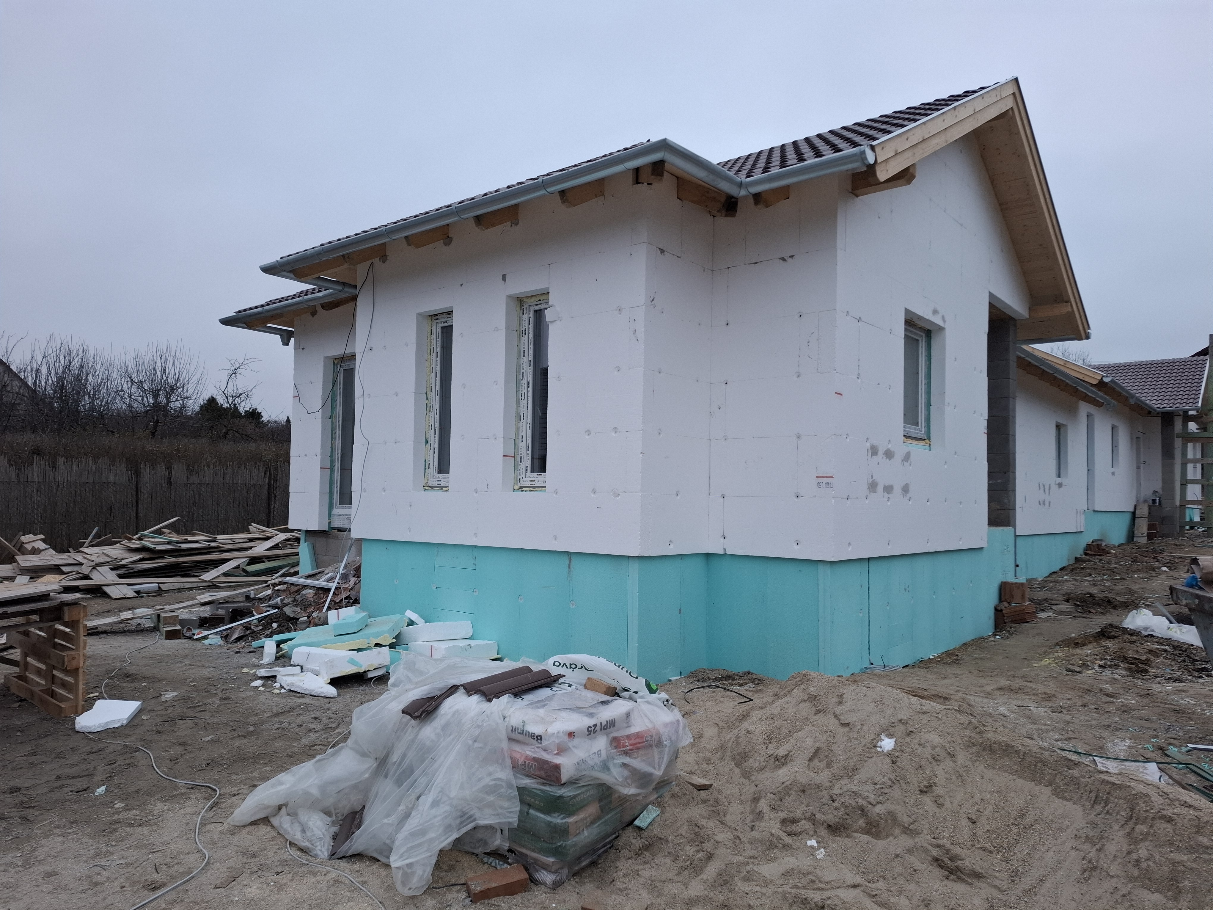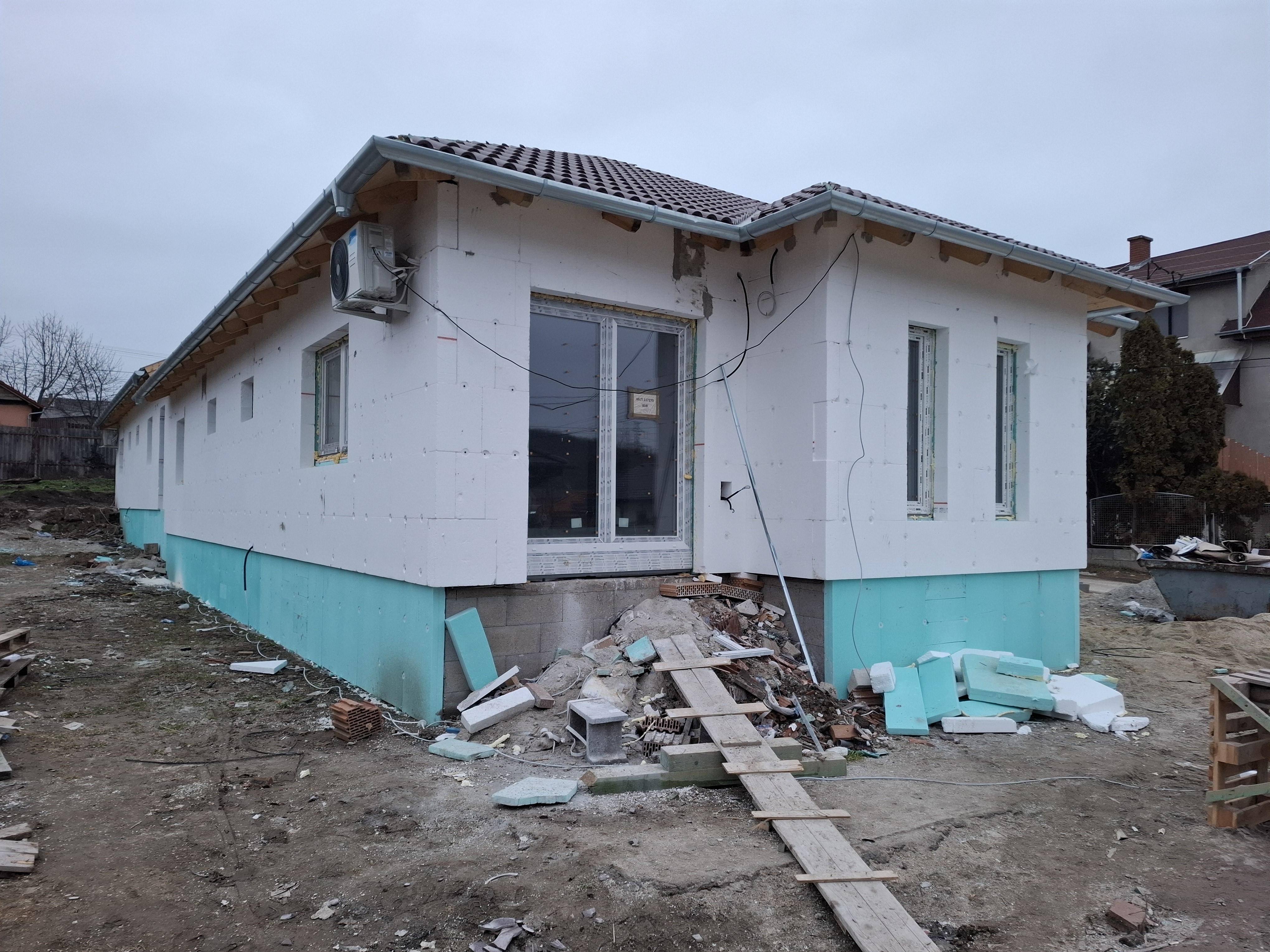 9. Az épület külső homlokzatát, színezését 15 cm vastag EPS 80 polisztirol lap hőszigeteléssel és 1,5 mm Baumit kapart színvakolattal készítjük. Lábazatra 12cm-es XPS szigetelés kerül, Revco mini gránit lábazati vakolat felhasználásával