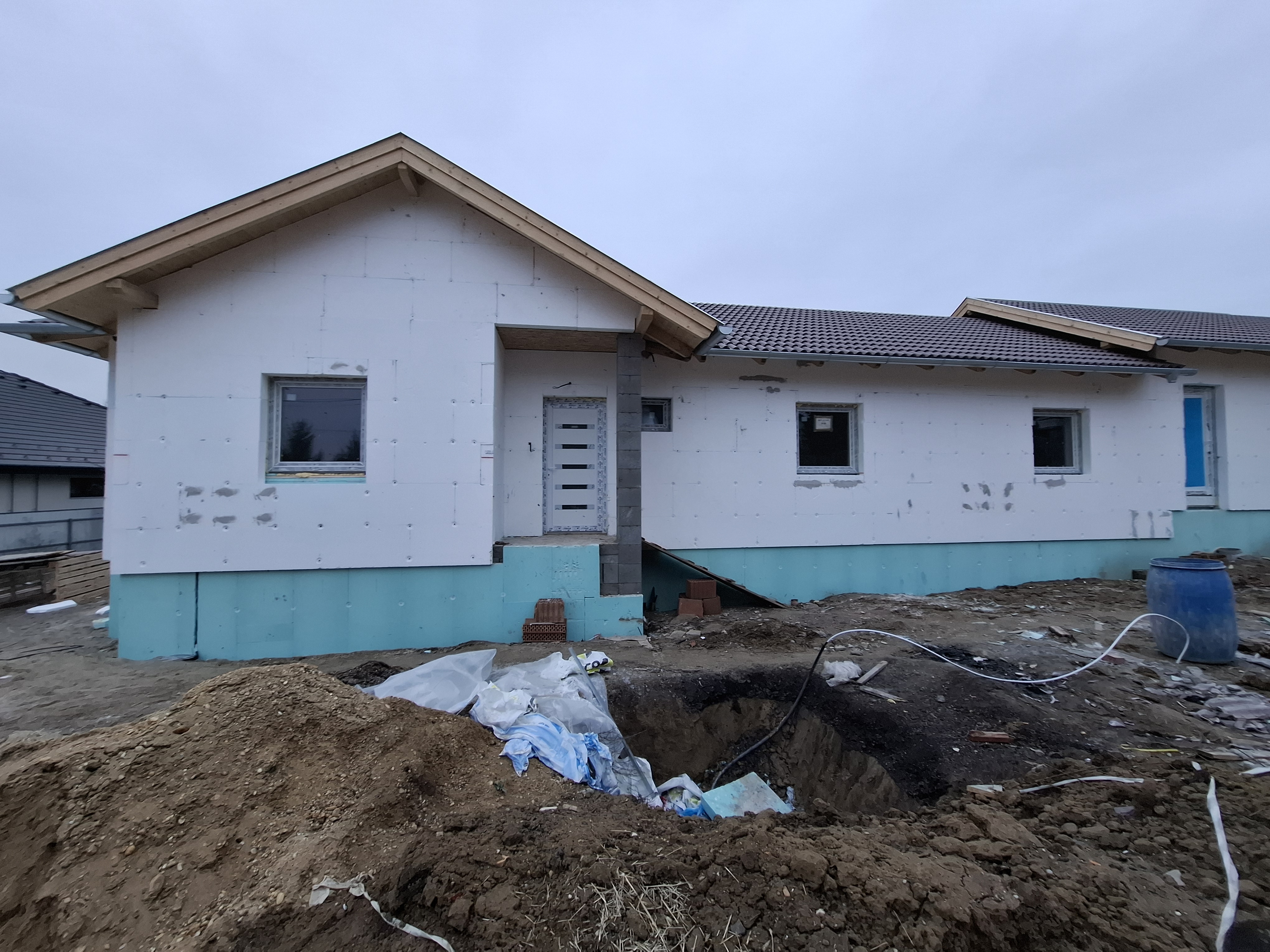 - Lábazat: a csatlakozó terepszint fölött 30 cm-ig a vízszintes vízszigetelés fel lesz vezetve az épület homlokzatára. A szigetelés a mechanikai hatások ellen zártcellás hőszigetelő anyaggal lesz védve, 15 cm XPS