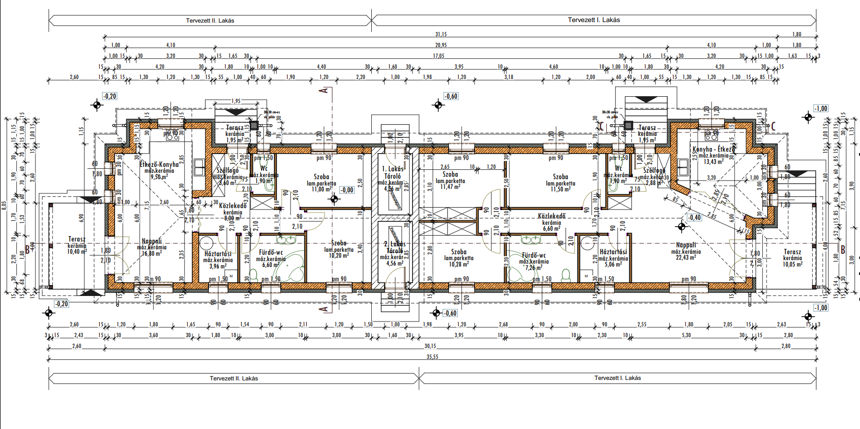 - Függőleges teherhordó szerkezet: vázkerámia teherhordó falszerkezetek, 30cm vtg Porotherm, vagy Leiertherm +vakolat