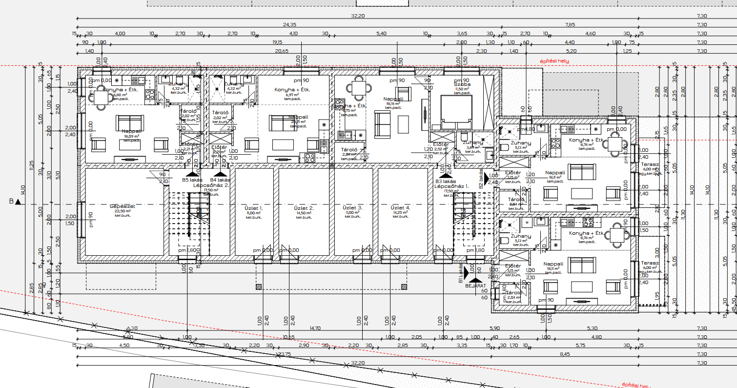- Függőleges teherhordó szerkezet: vázkerámia teherhordó falszerkezetek, 30cm vtg Porotherm vagy Leiertherm, +vakolat