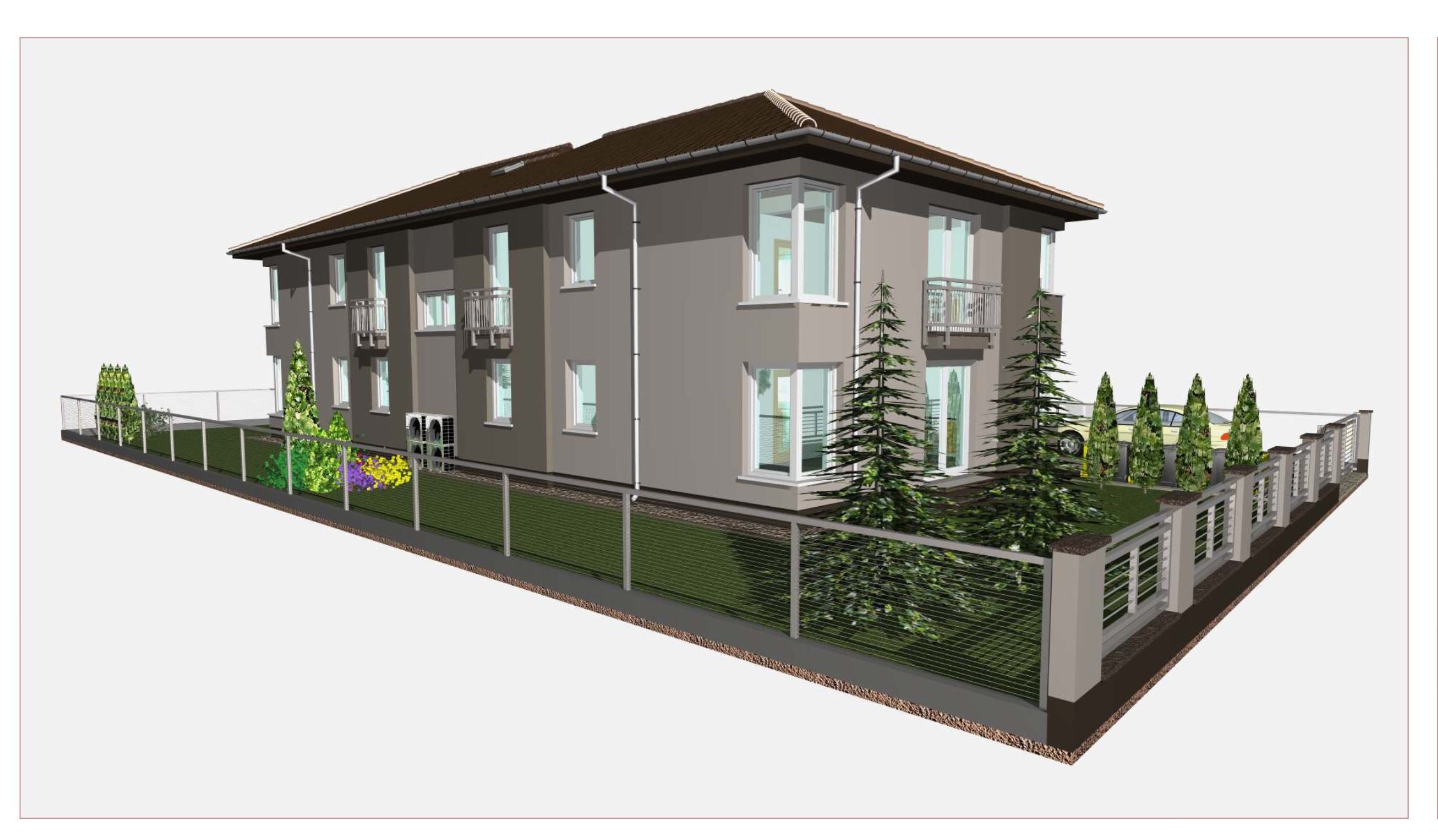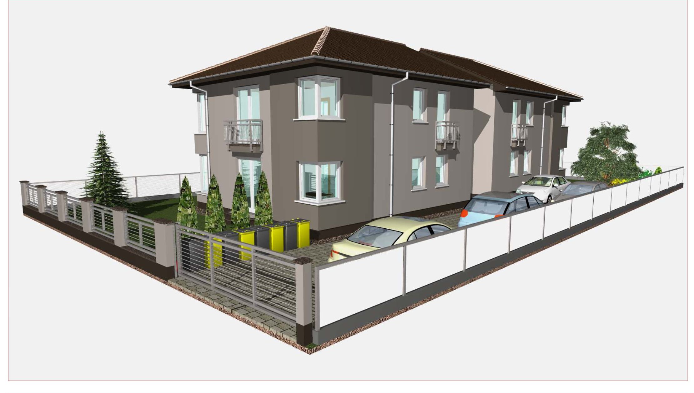 - Kerítés: egyszerű kerti szegély lábazat, vas oszlopok, közte deszka borítás, gyalult, festett kivitellel illetve lamellás szürke kerítéselemek a lakások között elválasztva. Az utca felé zsalukő lábazat, fehér színezéssel, beton oszlopokkal 1,8m magas, közte deszka borítással, antracit szürke színnel.