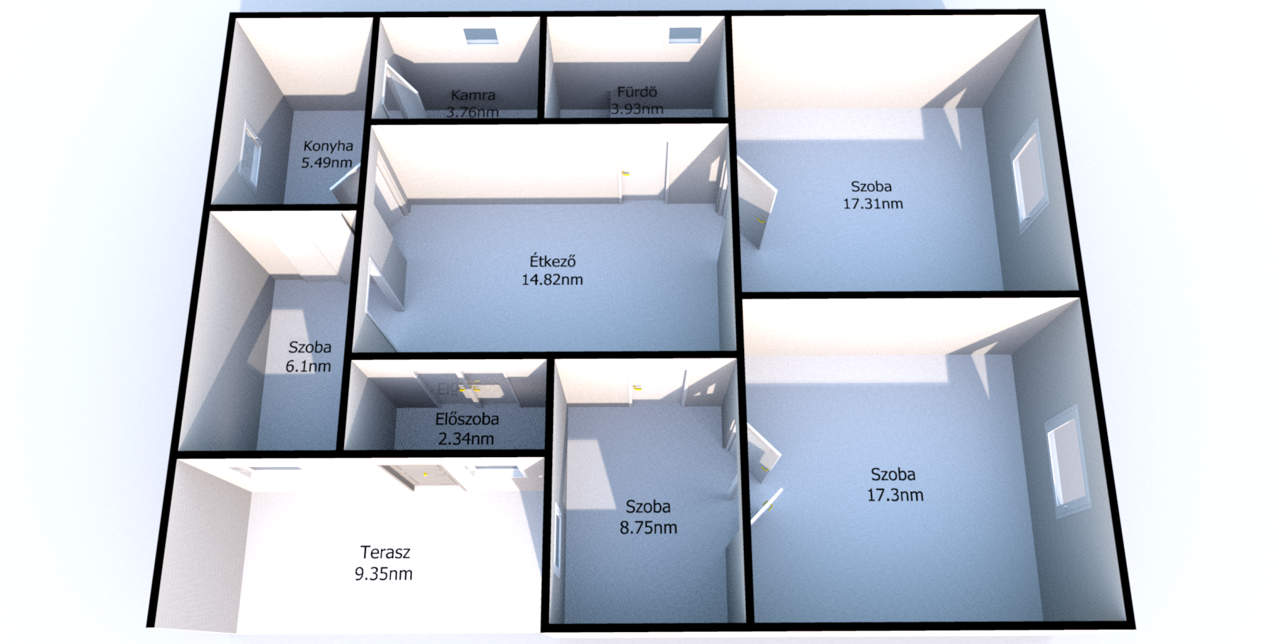 - Külső nyílászárók: Kömmerling 3 rétegű üvegezésű, kívülről-belülről fehér színben, redőnyökkel, szúnyoghálókkal