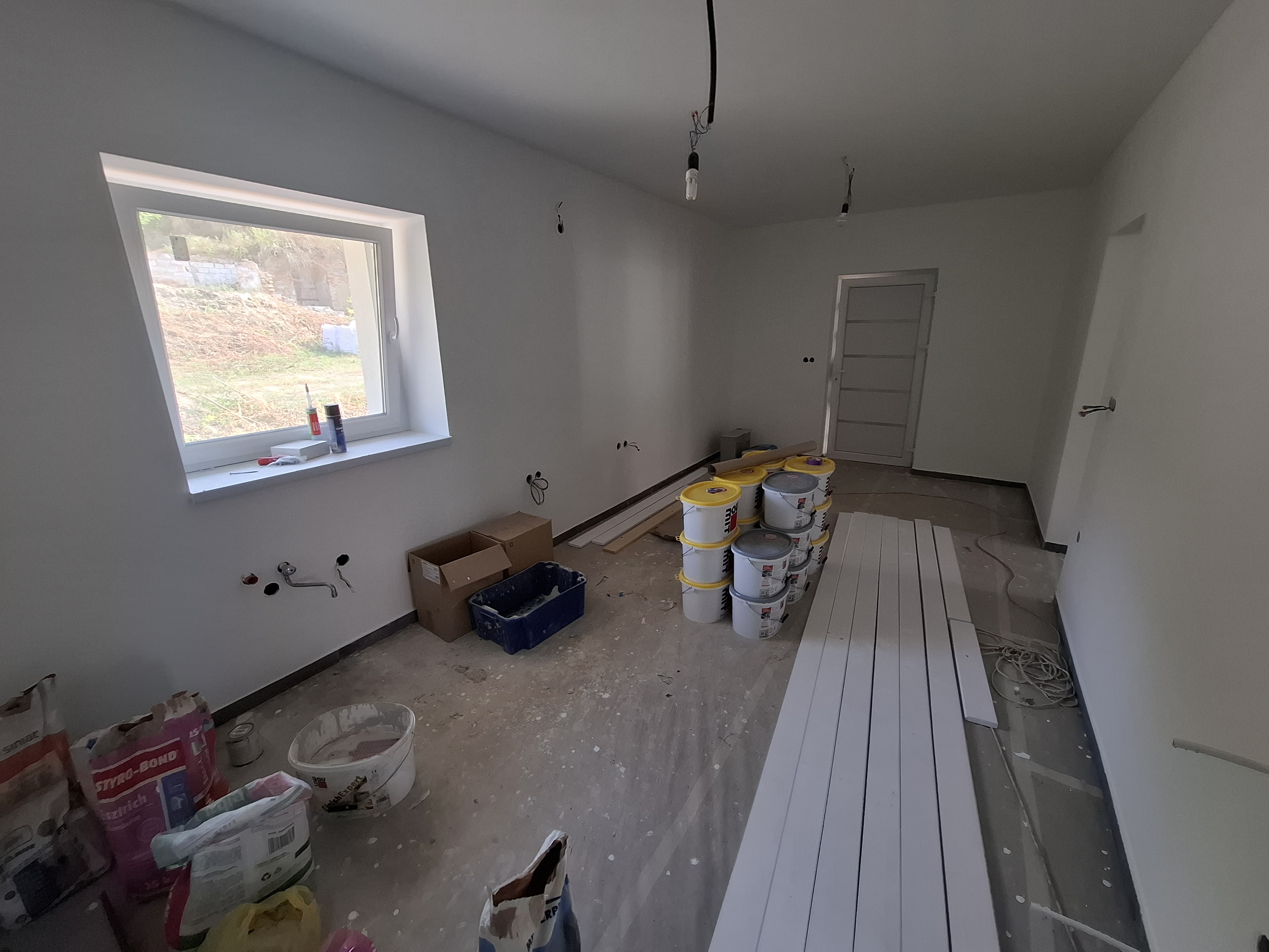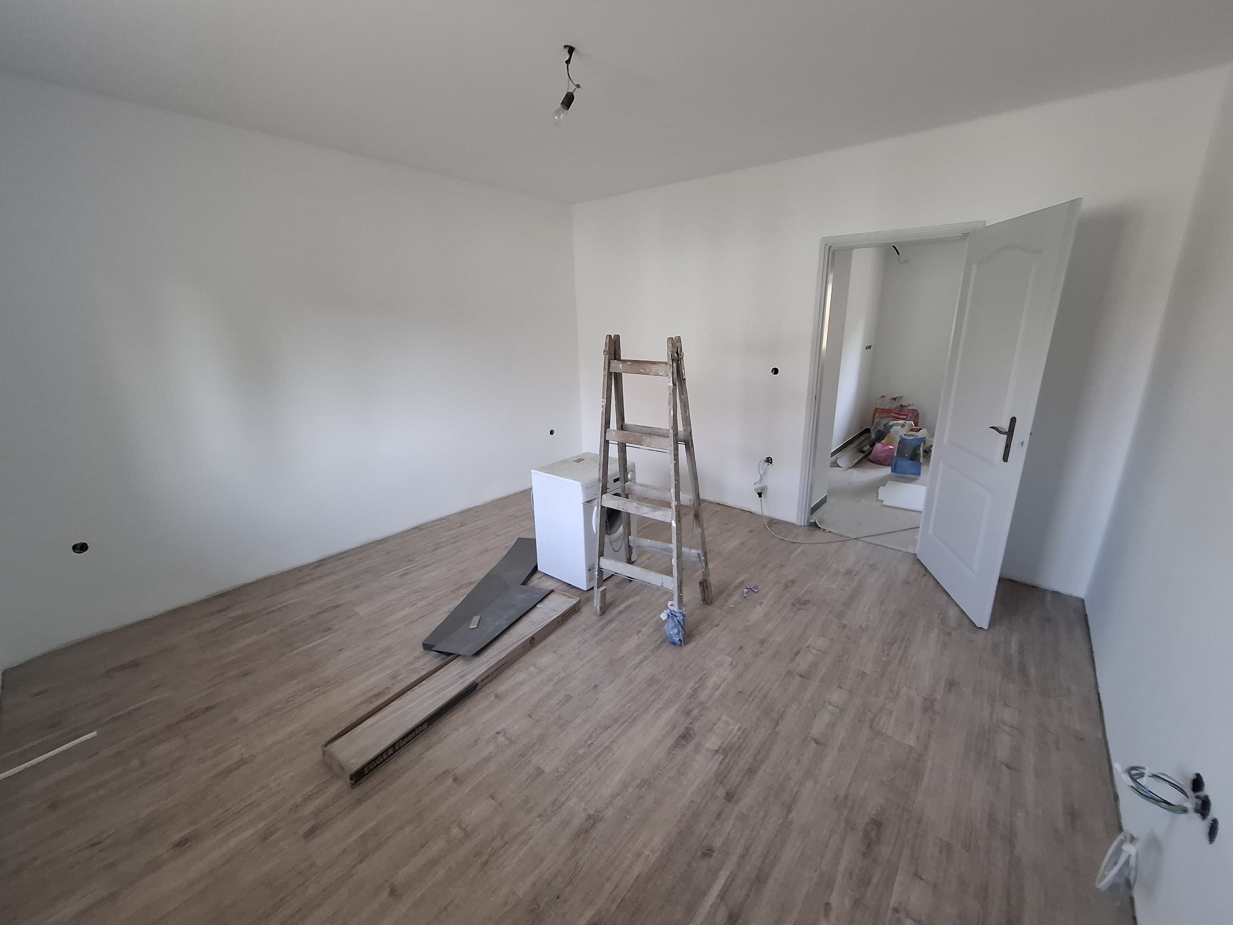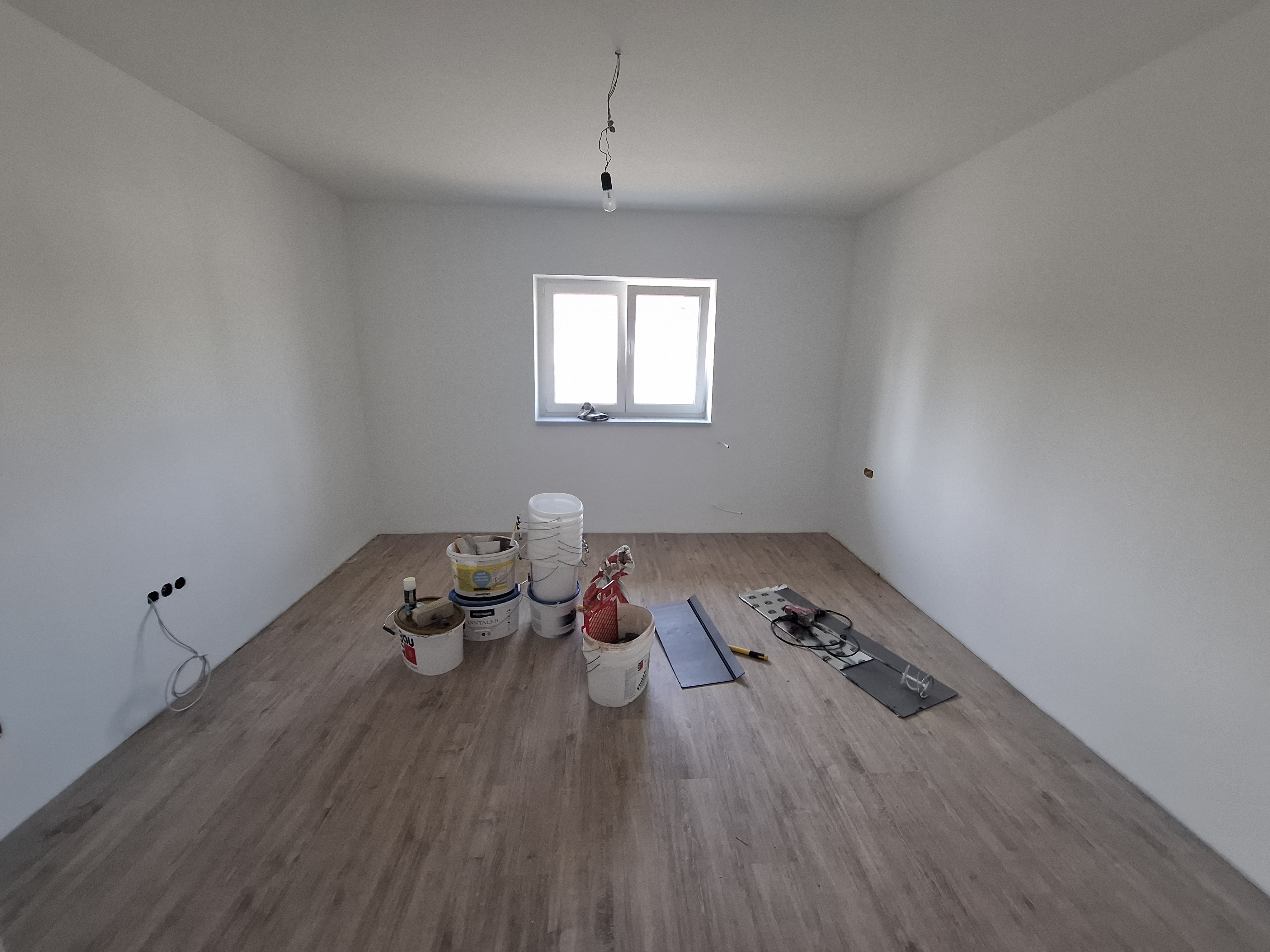 Falak festése : falak és a mennyezet glettelt, fehér festéssel.