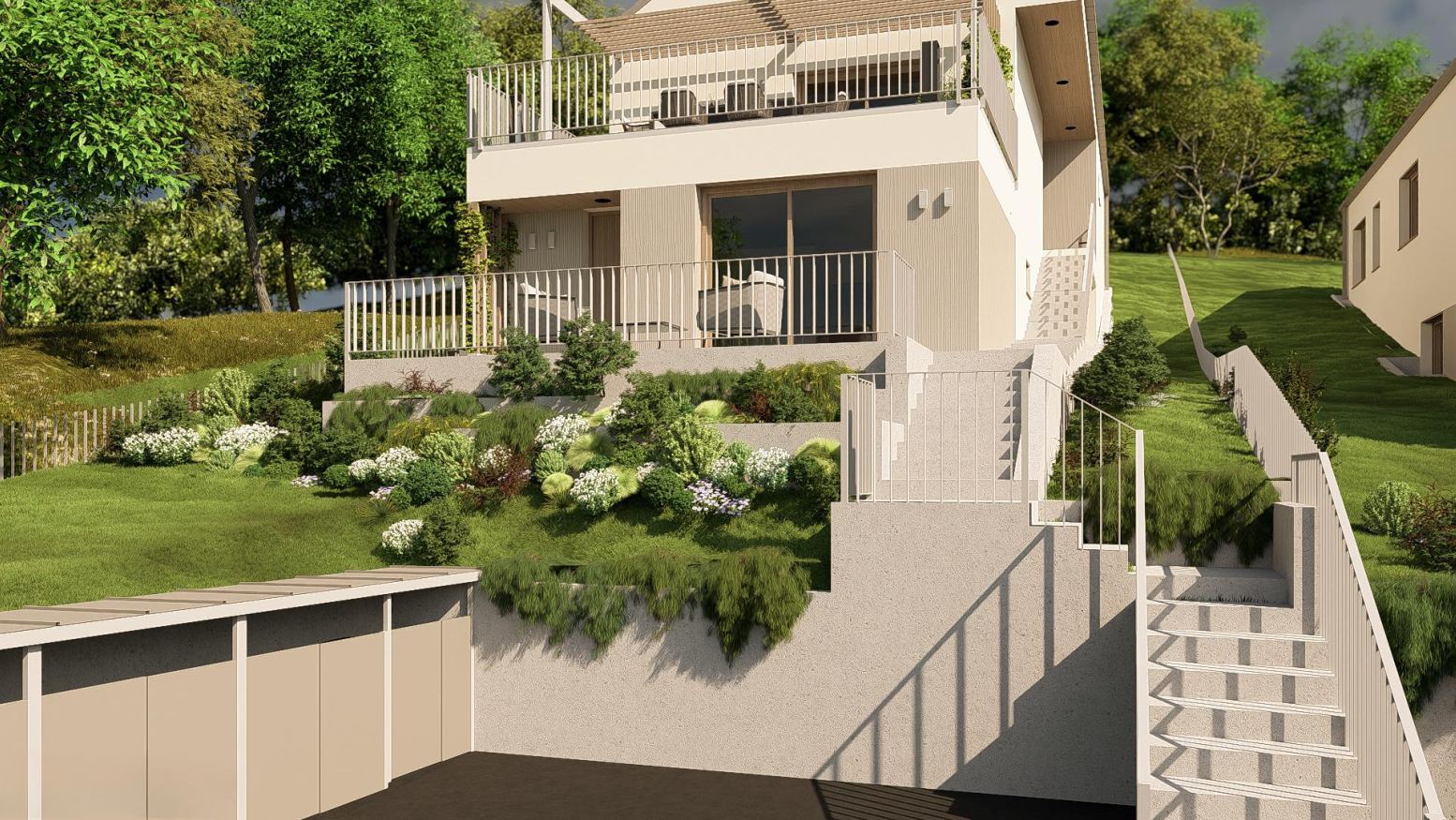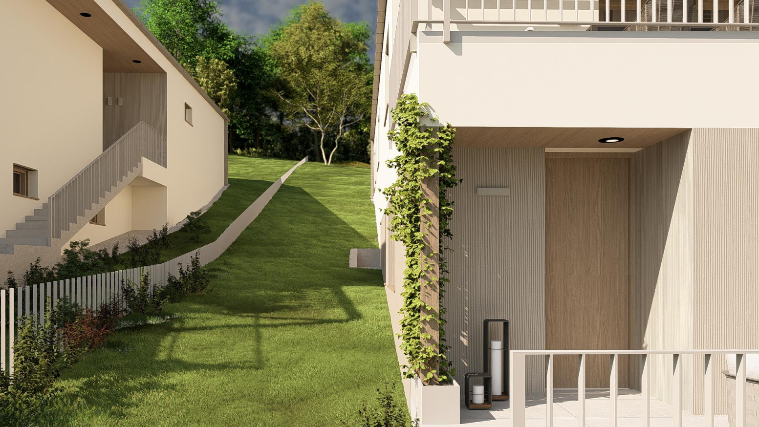 - Kerítés: egyszerű kerti szegély lábazat, vas oszlopok, közte deszka borítás, gyalult, festett kivitellel illetve lamellás szürke kerítéselemek a lakások között elválasztva. Az utca felé zsalukő lábazat, fehér színezéssel, beton oszlopokkal 1,8m magas, közte deszka borítással, antracit szürke színnel.