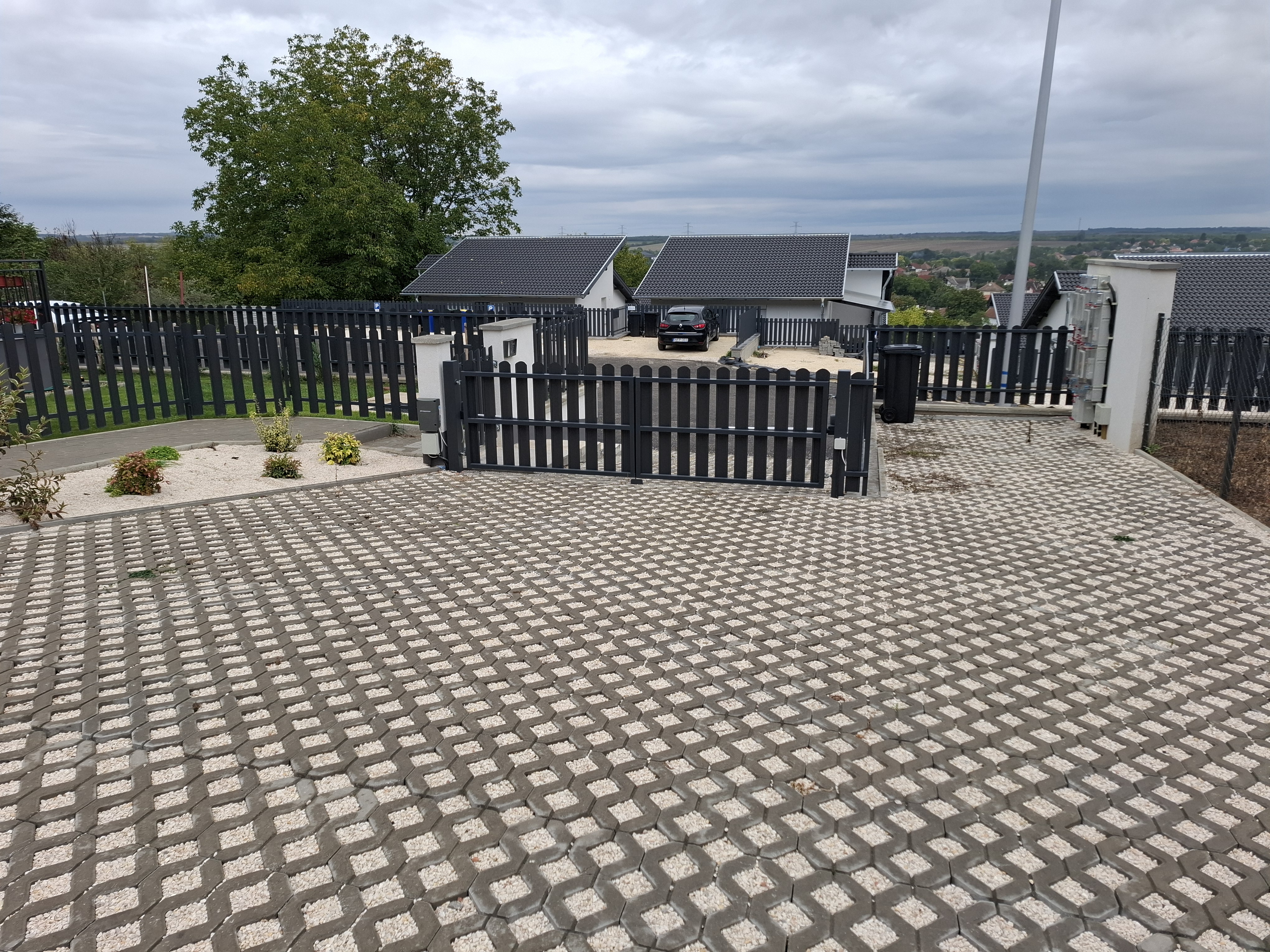 - Külső térszíni burkolat: beton szegéllyel ellátott szürke viacolor a terveken szereplő felületeken és mennyiségben