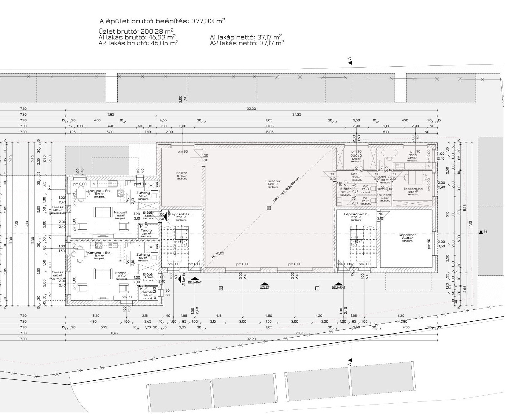 - Külső térszíni burkolt: beton szegéllyel ellátott, szürke viacolor a terveken szereplő felületeken és mennyiségben